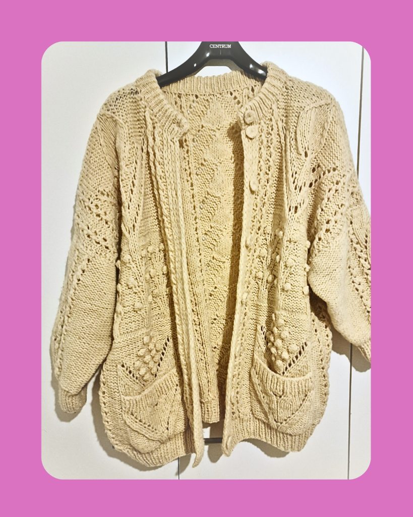 Tämä neuletakki ei ole vain lämmin vaate, vaan myös inspiraation lähde. Aion toistaa sen neulotut napit omassa työssäni, kun teen villatakin kumppanilleni. Olisipa mahdollista kiittää alkuperäistä neulojaa! Mutta ehkä se kiitos elää siinä, että neule saa uuden tarinan ja jatkaa lämmittämistä – sekä keholla että mielellä.”